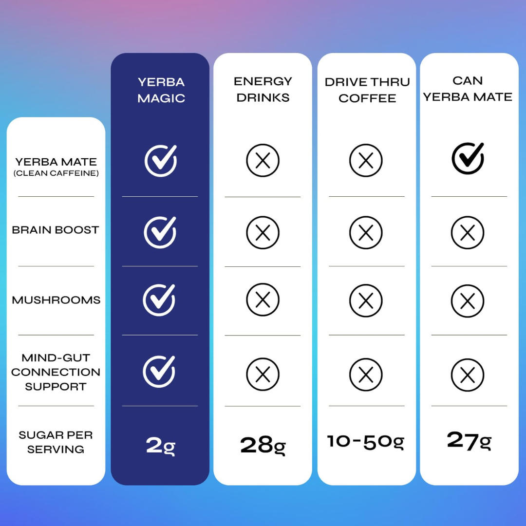 Don't settle for high-sugar drinks that do nothing for your mind or gut. Yerba Magic is your all-in-one powerhouse, delivering cognitive support, gut health, and vibrant energy with only 2g of sugar. It's not just a replacement for your old drink—it's the daily enhancement you deserve.